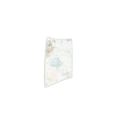 This thin slip of glass was buried deep and dug up again by foxes. It caught my eye, glinting like an opal in the dirt. Its multi-coloured, iridescent surface patina has formed in layers as the glass has been decomposed by water, scoured from the surface and deposited back in fine layers of pure silica, winter upon winter.
